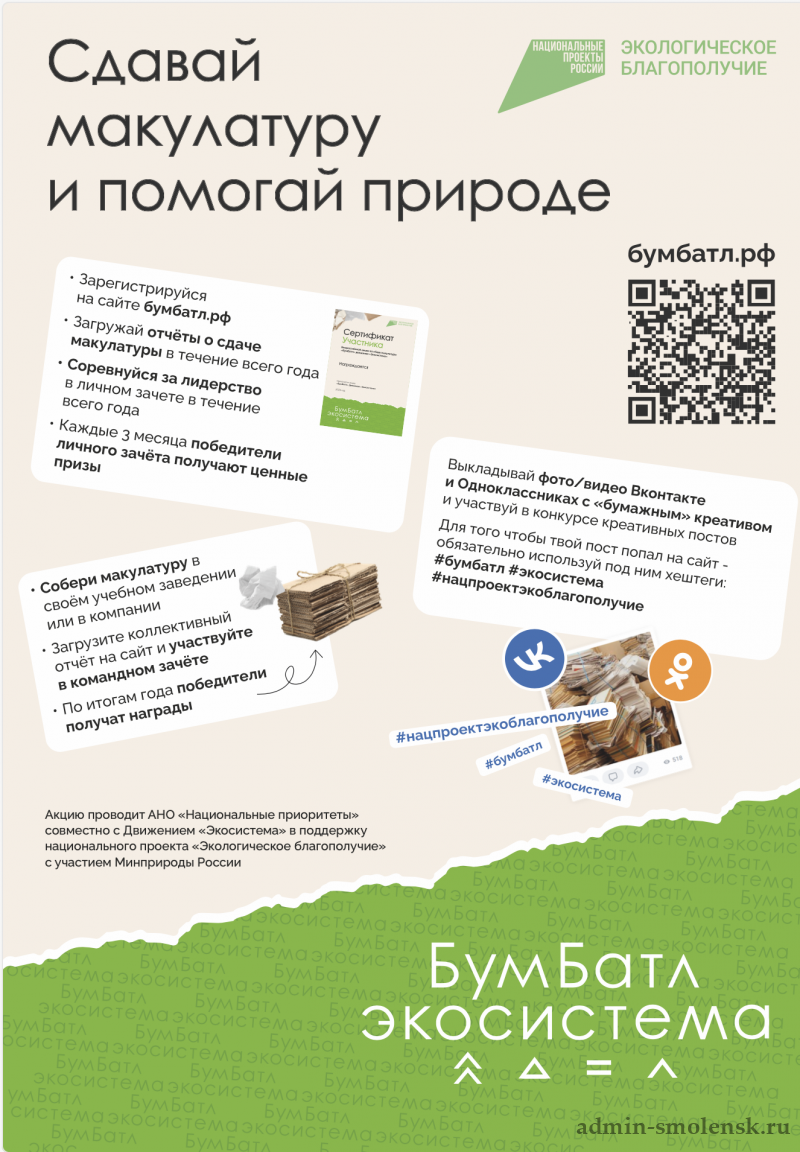 С 1 сентября 2025 года стартовал шестой сезон Всероссийской акции «БумБатл» — крупнейшего экологического проекта по сбору макулатуры. Мероприятие продлится до 31 марта 2026 года. С 2025 года акция переходит на круглогодичный формат, что позволяет гражданам участвовать в экологической инициативе в любое время года.